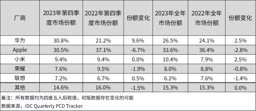 同時,2023 年第四季度,華為超過蘋果成為中國平板電腦市場出貨量第一。IDC 數(shù)據(jù)顯示華為曾在 2019 年 Q3 - 2020 年 Q1 實(shí)現(xiàn)過第一,不過后續(xù)又被蘋果反超回去,如今再次超越蘋果。