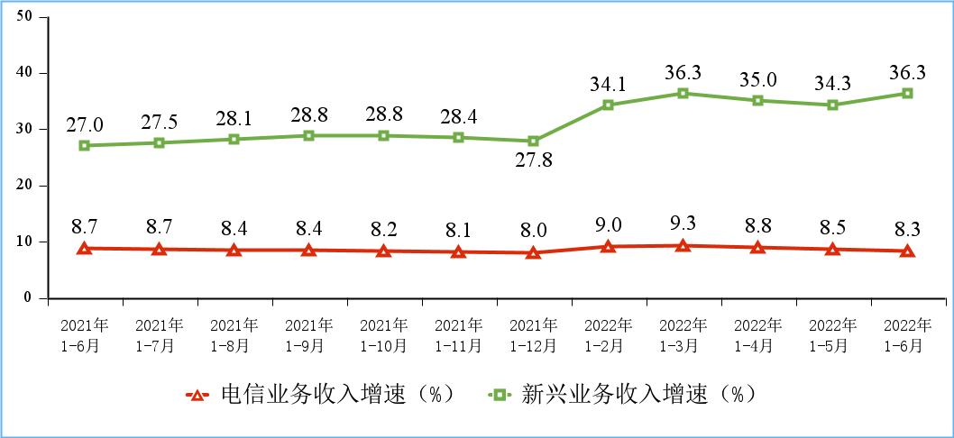 移動數(shù)據(jù)流量業(yè)務(wù)收入低速增長。上半年,三家基礎(chǔ)電信企業(yè)完成移動數(shù)據(jù)流量業(yè)務(wù)收入3336億元,同比增長0.7%,在電信業(yè)務(wù)收入中占比為40.9%,拉動電信業(yè)務(wù)收入增長0.3個百分點。