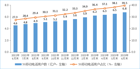 移動(dòng)電話用戶穩(wěn)中有增,5G用戶規(guī)模加速擴(kuò)大。截至6月末,三家基礎(chǔ)電信企業(yè)的移動(dòng)電話用戶總數(shù)達(dá)17.1億戶,比上年末凈增2653萬(wàn)戶。其中,5G移動(dòng)電話用戶達(dá)6.76億戶,比上年末凈增1.15億戶,占移動(dòng)電話用戶的39.5%,占比較上年末提高6.2個(gè)百分點(diǎn)。