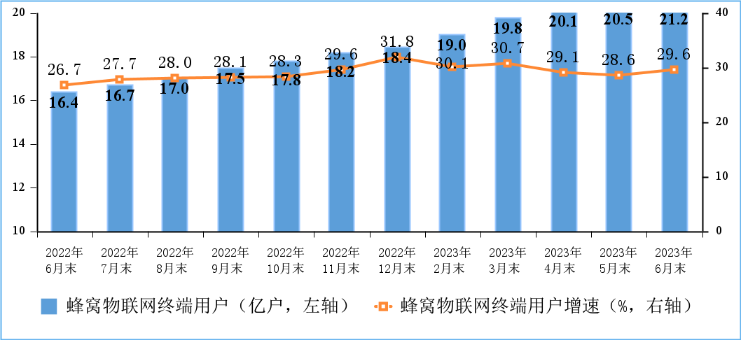 蜂窩物聯(lián)網(wǎng)用戶較快增長(zhǎng),IPTV用戶穩(wěn)步增加。截至6月末,三家基礎(chǔ)電信企業(yè)發(fā)展蜂窩物聯(lián)網(wǎng)終端用戶21.2億戶,比上年末凈增2.79億戶,占移動(dòng)網(wǎng)終端連接數(shù)(包括移動(dòng)電話用戶和蜂窩物聯(lián)網(wǎng)終端用戶)的比重達(dá)55.4%。IPTV(網(wǎng)絡(luò)電視)總用戶數(shù)達(dá)3.92億戶,比上年末凈增1148萬(wàn)戶。