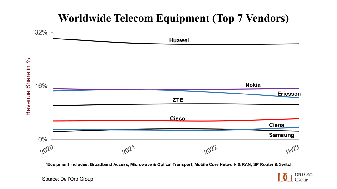 Stefan Pongratz表示,2022年至2023年上半年,供應(yīng)商動(dòng)態(tài)基本保持穩(wěn)定,但也有少數(shù)例外。Ciena超越了三星,諾基亞和愛立信之間的差距拉大,這在一定程度上反映了無線和有線技術(shù)的組合。盡管美國(guó)政府一直在努力限制華為的潛在市場(chǎng),限制該公司使用最新的芯片,但Dell'Oro Group的分析顯示,華為仍然在全球電信設(shè)備市場(chǎng)處于領(lǐng)先地位。這在一定程度上是因?yàn)槿A為在Dell'Oro Group追蹤的六個(gè)細(xì)分電信領(lǐng)域中的五個(gè)領(lǐng)域仍然是排名第一的供應(yīng)商,而且華為繼續(xù)主導(dǎo)北美以外的市場(chǎng),占2013年上半年收入的35%至40%。