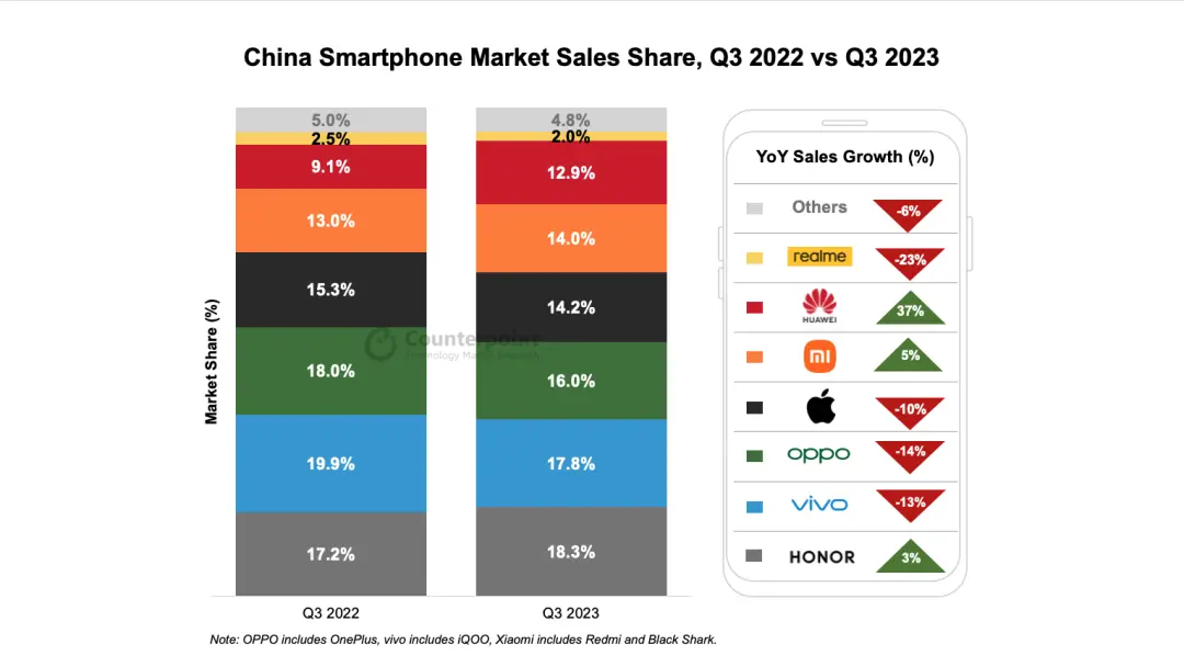 中國智能手機(jī)市場銷售份額,2022年Q3 vs 2023年Q3