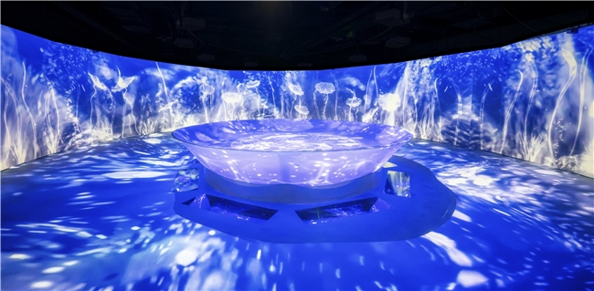 在展覽中,觀眾可以直觀地欣賞到數(shù)字技術(shù)如何使傳統(tǒng)紋樣煥發(fā)新生。展館中庭區(qū)域以裸眼3D形式新生的數(shù)字文物全方位展現(xiàn)了紋樣的靈動之美;脫胎于自然的蓮花、鷺鷥、枇杷、鯉魚等紋樣在數(shù)字化光影中重發(fā)煥彩,古人對自然與生活的細致觀察與豐富想象在“‘紋’法自然”展區(qū)得以具象化;在“紋窗弄影”展區(qū),觀眾可穿梭在宮墻間,感受三交六菀菱花窗影旁的故宮四季;在“流光溢彩”展區(qū),動態(tài)光影的流動交織賦予了云龍紋、海水龍紋、纏枝蓮紋、蝠桃紋蓬勃的生命力與無盡延展的空間感,觀眾仿佛步入由紋樣構(gòu)建的瑰麗夢境;“錦繡世界”展區(qū)以萬花筒形式呈現(xiàn)了乾隆款畫琺瑯團錦花紋蓋罐等器物上豐富多彩的紋樣組合,把傳統(tǒng)紋樣化作絢麗多變的視覺奇觀;“夢幻江南”則利用虛擬現(xiàn)實技術(shù)生動還原了故宮倦勤齋的室內(nèi)戲臺區(qū)域,帶領(lǐng)觀眾進入乾隆皇帝對于江南的遐想空間。