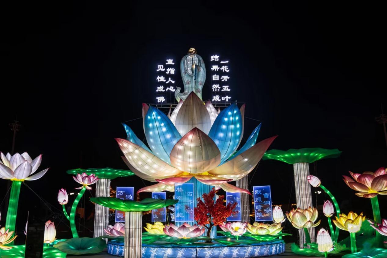 燈展分寺外寺內(nèi)兩個(gè)區(qū)域,其中寺外燈展位于南華禪寺對(duì)面廣場(chǎng),多組花卉燈彩取花團(tuán)錦簇之意,為廣大市民與游客提供打卡游玩的好去處。寺內(nèi)燈展線路圍繞中軸線核心,全程設(shè)置十余組精美燈彩藝術(shù)裝置,并按照禪心映照、心愿祈福、歷史回響、傳承之光四大篇章緩緩鋪陳,充分展示南華禪寺禪宗文化脈絡(luò)、憨山大師重要事跡以及歷史文人與南華禪寺的生動(dòng)故事。