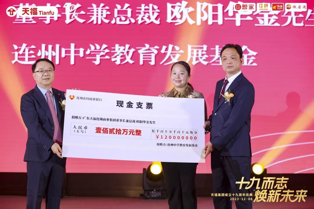 2023年12月,在連州中學(xué)成立120周年慶典上,歐陽(yáng)華金為支持母校連州中學(xué)的教育發(fā)展,向連州中學(xué)教育發(fā)展基金捐贈(zèng)120萬(wàn)元。
