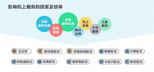 調(diào)查顯示,空乘人員的服務(wù)品質(zhì)和態(tài)度能最直接地影響乘客在飛行途中的機(jī)艙體驗(yàn)。中國出境游旅客對機(jī)上服務(wù)的評價(jià)指標(biāo)及要求越來越細(xì)節(jié)化,對人性化的服務(wù)內(nèi)容有了更高的要求。此外,航班是否提供中文服務(wù)和對待兒童的服務(wù)水平也相繼成為影響旅客對機(jī)艙服務(wù)的評價(jià)的重要因素。數(shù)據(jù)顯示,中國出境游旅行對亞太地區(qū)航空公司的機(jī)上服務(wù)認(rèn)可度較高,其中全日空航空公司的機(jī)上服務(wù)水平以總88分獲得乘客最高評價(jià),其專業(yè)貼心的日式服務(wù)讓好口碑得以延續(xù);緊隨其后的是新加坡航空、阿提哈德航空和國泰航空。國內(nèi)航空公司中,海南航空以58分實(shí)力位列第七名,成為唯一入駐前十名的國內(nèi)航司。