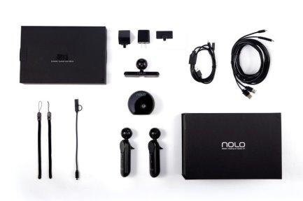 NOLO的包裝分為上下兩層。上為配件層,內(nèi)含:電源適配器、各種型號(hào)的連接線及兩種不同規(guī)格的NOLO頭盔定位器卡座;下層為NOLO主體套件,內(nèi)含:兩個(gè)交互手柄、NOLO定位基站及頭盔定位器。