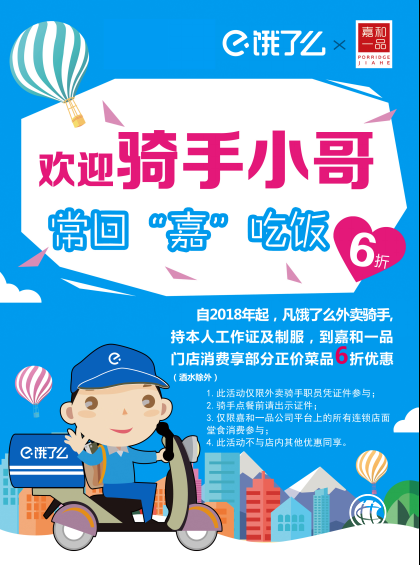 自2018年起,為了感謝餓了么外賣小哥不辭勞苦的付出,凡餓了么外賣騎手,持本人工作證及制服,到嘉和一品門店消費(fèi)可享受部分正價(jià)菜品6折優(yōu)惠。