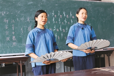 江永女書傳承人胡欣(右)用吟唱方式向游客介紹女書文化。