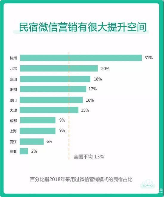 從營銷方面來看,全國各地13%的目的地民宿都在選擇使用微信營銷,可以說民宿微信營銷仍有較大提升空間。其中,杭州高達31%,北京高達20%,深圳18%,陽朔17%,廈門16%,大理15%均高出平均線。從民宿回頭率來看,北京、三亞、上海、程度、杭州等均高于其他旅游目的地,大理、麗江相對來說回頭率低一些。