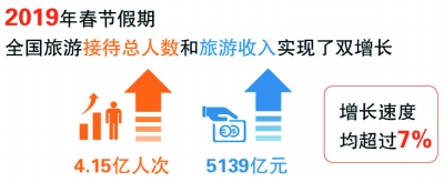 2019年春節(jié)假期,全國旅游接待總?cè)藬?shù)和旅游收入實(shí)現(xiàn)雙增長,增長速度均超過7%,分別達(dá)到4.15億人次、5139億元;短視頻、網(wǎng)絡(luò)直播助力“吃住行游購?qiáng)?rdquo;等傳統(tǒng)業(yè)態(tài)發(fā)展;互聯(lián)網(wǎng)上網(wǎng)服務(wù)行業(yè)深入開展轉(zhuǎn)型升級,呈現(xiàn)出良好發(fā)展態(tài)勢;“文明旅游 為中國加分”活動深入人心,中國出境游游客越來越受歡迎;中國電子競技行業(yè)在國際上嶄露頭角,收獲多項(xiàng)國際大獎……