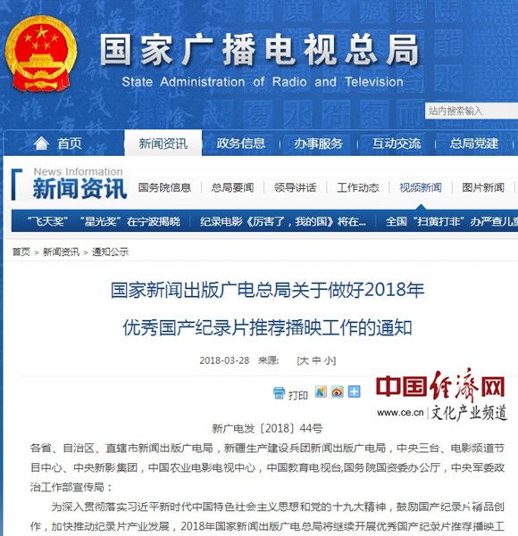 原標(biāo)題:廣電總局:做好2018年優(yōu)秀國(guó)產(chǎn)紀(jì)錄片推薦播映工作