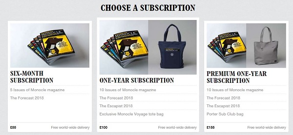 除此之外,《Monocle》 2018年的期刊也在征訂當中,其中一個選擇為十期雜志加上兩期年刊與一只帆布包,共計100英鎊。