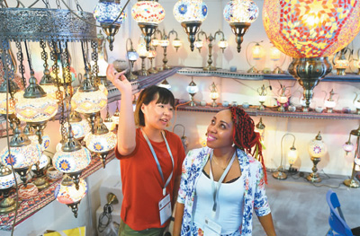 5月6日,2018中國義烏進口商品博覽會開幕。圖為參展商向外商介紹土耳其工藝燈。龔獻明(人民視覺)