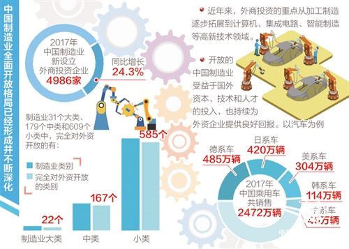 制造業(yè)一直是外商投資的重點領域。據(jù)統(tǒng)計,2017年中國制造業(yè)新設立外商投資企業(yè)4986家,同比增長24.3%。新修訂的《外商投資產(chǎn)業(yè)指導目錄(2017年)》大幅壓減了對外商投資的準入限制,在制造業(yè)31個大類、179個中類和609個小類中,完全對外資開放的已有22個大類、167個中類和585個小類,分別占71%、93.3%和96.1%。與此同時,中國企業(yè)海外投資近年來也呈現(xiàn)強勁增長態(tài)勢,制造業(yè)占海外投資比重三分之一以上,覆蓋紡織、食品、機械、汽車、電子等眾多領域。