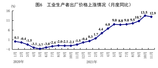 11月份,全國(guó)工業(yè)生產(chǎn)者出廠價(jià)格同比上漲12.9%,漲幅比上月回落0.6個(gè)百分點(diǎn);環(huán)比持平。工業(yè)生產(chǎn)者購(gòu)進(jìn)價(jià)格同比上漲17.4%,漲幅比上月擴(kuò)大0.3個(gè)百分點(diǎn);環(huán)比上漲1.0%。1-11月份,全國(guó)工業(yè)生產(chǎn)者出廠價(jià)格、工業(yè)生產(chǎn)者購(gòu)進(jìn)價(jià)格同比分別上漲7.9%、10.7%。