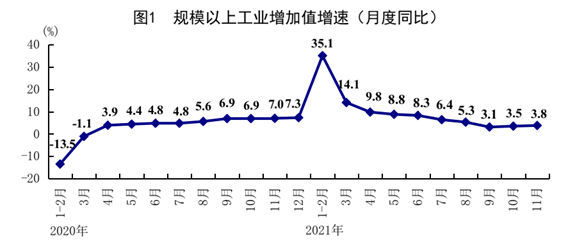 11月份,全國(guó)規(guī)模以上工業(yè)增加值同比增長(zhǎng)3.8%,比上月加快0.3個(gè)百分點(diǎn);兩年平均增長(zhǎng)5.4%,比上月加快0.2個(gè)百分點(diǎn);環(huán)比增長(zhǎng)0.37%。分三大門類看,采礦業(yè)增加值同比增長(zhǎng)6.2%,制造業(yè)增長(zhǎng)2.9%,電力、熱力、燃?xì)饧八a(chǎn)和供應(yīng)業(yè)增長(zhǎng)11.1%。高技術(shù)制造業(yè)增加值同比增長(zhǎng)15.1%,比上月加快0.4個(gè)百分點(diǎn);兩年平均增長(zhǎng)12.9%。分產(chǎn)品看,新能源汽車、工業(yè)機(jī)器人、集成電路產(chǎn)量同比分別增長(zhǎng)112.0%、27.9%、11.9%。分經(jīng)濟(jì)類型看,國(guó)有控股企業(yè)增加值同比增長(zhǎng)3.6%;股份制企業(yè)增長(zhǎng)4.5%,外商及港澳臺(tái)商投資企業(yè)增長(zhǎng)1.9%;私營(yíng)企業(yè)增長(zhǎng)3.9%。1-11月份,全國(guó)規(guī)模以上工業(yè)增加值同比增長(zhǎng)10.1%,兩年平均增長(zhǎng)6.1%。11月份,制造業(yè)采購(gòu)經(jīng)理指數(shù)為50.1%。1-10月份,全國(guó)規(guī)模以上工業(yè)企業(yè)實(shí)現(xiàn)利潤(rùn)總額71650億元,同比增長(zhǎng)42.2%,兩年平均增長(zhǎng)19.7%;規(guī)模以上工業(yè)企業(yè)營(yíng)業(yè)收入利潤(rùn)率為7.01%,同比提高1.04個(gè)百分點(diǎn)。