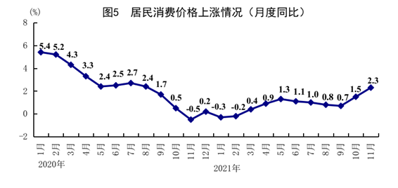 11月份,全國(guó)居民消費(fèi)價(jià)格(CPI)同比上漲2.3%,漲幅比上月擴(kuò)大0.8個(gè)百分點(diǎn);環(huán)比上漲0.4%。分類別看,食品煙酒價(jià)格同比上漲1.7%,衣著價(jià)格上漲0.5%,居住價(jià)格上漲1.7%,生活用品及服務(wù)價(jià)格上漲0.5%,交通通信價(jià)格上漲7.6%,教育文化娛樂(lè)價(jià)格上漲3.0%,醫(yī)療保健價(jià)格上漲0.6%,其他用品及服務(wù)價(jià)格下降0.6%。在食品煙酒價(jià)格中,豬肉價(jià)格同比下降32.7%,糧食價(jià)格上漲1.5%,鮮果價(jià)格上漲4.1%,鮮菜價(jià)格上漲30.6%。扣除食品和能源價(jià)格后的核心CPI同比上漲1.2%,漲幅比上月回落0.1個(gè)百分點(diǎn)。1-11月份,全國(guó)居民消費(fèi)價(jià)格同比上漲0.9%。