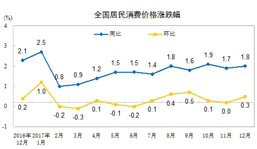 國家統(tǒng)計局今日公布2017年12月CPI,數(shù)據(jù)顯示,2017年12月份,全國居民消費價格同比上漲1.8%。其中,城市上漲1.9%,農(nóng)村上漲1.7%;食品價格下降0.4%,非食品價格上漲2.4%;消費品價格上漲1.1%,服務價格上漲3.0%。12月份,全國居民消費價格環(huán)比上漲0.3%。其中,城市上漲0.3%,農(nóng)村上漲0.4%;食品價格上漲1.1%,非食品價格上漲0.1%;消費品價格上漲0.5%,服務價格上漲0.1%。