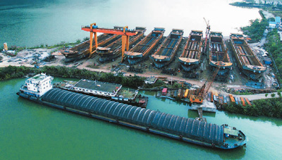圖為重慶市云陽縣青龍街道健民村三壩溪船舶建造基地的航拍照片,7艘主體基本完成的新船矗立在庫岸邊。饒國君 攝(人民圖片)