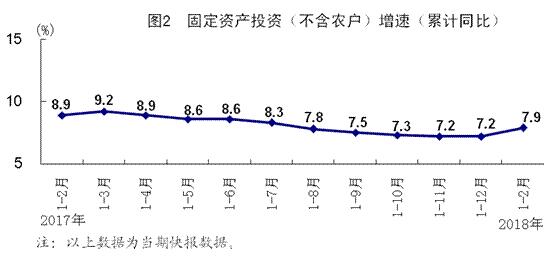 1-2月份,全國固定資產(chǎn)投資(不含農(nóng)戶)44626億元,同比增長7.9%,增速比上年全年加快0.7個(gè)百分點(diǎn),比上年同期回落1.0個(gè)百分點(diǎn)。其中,民間投資26988億元,增長8.1%。分產(chǎn)業(yè)看,第一產(chǎn)業(yè)投資1132億元,同比增長27.8%;第二產(chǎn)業(yè)投資14850億元,增長2.4%,其中制造業(yè)投資增長4.3%;第三產(chǎn)業(yè)投資28644億元,增長10.2%,其中基礎(chǔ)設(shè)施投資增長16.1%。產(chǎn)業(yè)投資結(jié)構(gòu)繼續(xù)優(yōu)化。高技術(shù)制造業(yè)投資、服務(wù)業(yè)投資同比增速分別快于全部投資3.4和2.3個(gè)百分點(diǎn)。短板領(lǐng)域投資加快,生態(tài)保護(hù)和環(huán)境治理業(yè)、公共設(shè)施管理業(yè)、農(nóng)業(yè)投資同比分別增長39.3%、15.6%和22.9%,分別快于全部投資31.4、7.7和15.0個(gè)百分點(diǎn)。從環(huán)比看,2月份固定資產(chǎn)投資(不含農(nóng)戶)比上月增長0.61%。