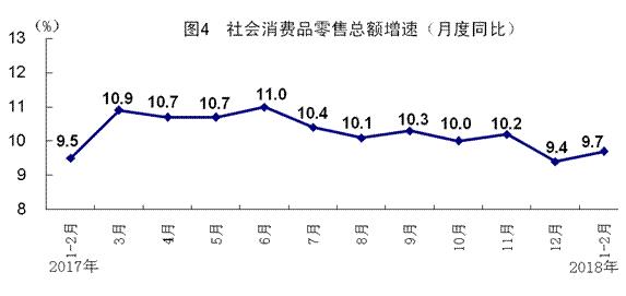 1-2月份,社會消費(fèi)品零售總額61082億元,同比增長9.7%,增速比上年12月份加快0.3個(gè)百分點(diǎn),比上年同期加快0.2個(gè)百分點(diǎn)。按經(jīng)營單位所在地分,城鎮(zhèn)消費(fèi)品零售額52046億元,同比增長9.6%;鄉(xiāng)村消費(fèi)品零售額9036億元,增長10.7%。按消費(fèi)類型分,餐飲收入6613億元,增長10.1%;商品零售54469億元,增長9.7%。消費(fèi)升級類商品快速增長,限額以上單位中西藥品類、化妝品類、通訊器材類商品零售額同比分別增長10.1%、12.5%和10.7%。從環(huán)比看,2月份社會消費(fèi)品零售總額比上月增長0.76%。