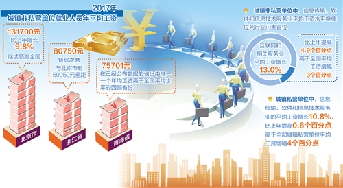 2017年,在城鎮(zhèn)非私營(yíng)單位中,信息傳輸、軟件和信息技術(shù)服務(wù)業(yè)平均工資水平繼續(xù)位列行業(yè)門(mén)類首位,其中互聯(lián)網(wǎng)和相關(guān)服務(wù)業(yè)平均工資增長(zhǎng)13.0%,比上年提高4.9個(gè)百分點(diǎn),高于全國(guó)平均工資增幅3個(gè)百分點(diǎn)。在城鎮(zhèn)私營(yíng)單位中,信息傳輸、軟件和信息技術(shù)服務(wù)業(yè)的平均工資增長(zhǎng)10.8%,比上年提高0.6個(gè)百分點(diǎn),高于全部城鎮(zhèn)私營(yíng)單位平均工資增幅4個(gè)百分點(diǎn)。