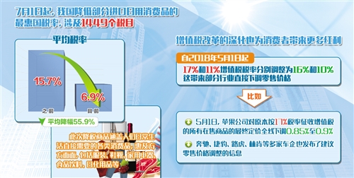 增值稅改革的深化也為消費(fèi)者帶來(lái)更多紅利。自2018年5月1日起,17%和11%增值稅稅率分別調(diào)整為16%和10%。這部分行業(yè)直接下調(diào)了零售價(jià)格。比如,5月1日,蘋(píng)果公司對(duì)原本按17%稅率征收增值稅的所有在售商品最終定價(jià)全線下調(diào)0.85%至0.9%。奔馳、捷豹、路虎、林肯等多家車企也發(fā)布了建議零售價(jià)格調(diào)整的信息。