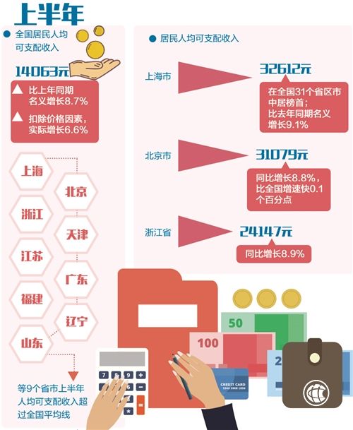 從省份看,上海、北京、浙江、天津、江蘇、廣東、福建、遼寧、山東等9個省市上半年人均可支配收入超過全國14063元的平均線;從增速看,有19個省區(qū)市的人均可支配收入同比增速跑贏全國8.7%的增速。