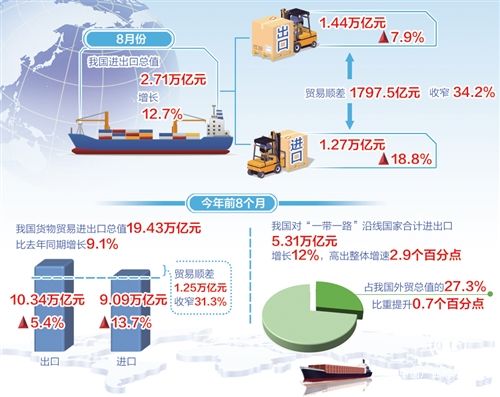 今年前8個月,我國貨物貿(mào)易進(jìn)出口總值19.43萬億元,同比增長9.1%。其中,出口10.34萬億元,增長5.4%;進(jìn)口9.09萬億元,增長13.7%;貿(mào)易順差1.25萬億元,收窄31.3%。