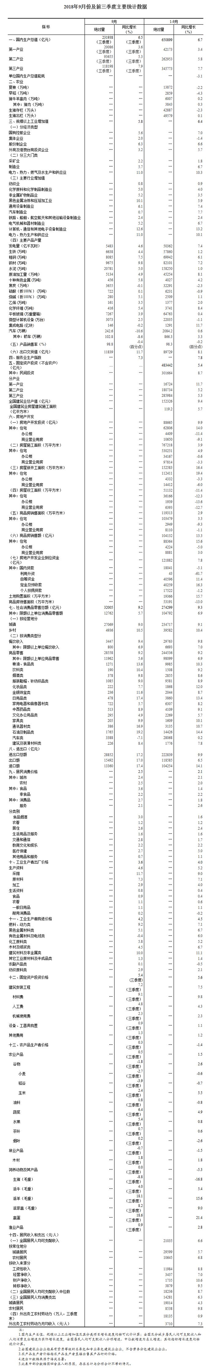 產(chǎn)能利用率保持穩(wěn)定。前三季度,全國工業(yè)產(chǎn)能利用率為76.6%,與上年同期持平。三季度,黑色金屬冶煉和壓延加工業(yè)、煤炭開采和洗選業(yè)產(chǎn)能利用率分別為78.7%和70.1%,分別比上年同期提高2.0和1.1個(gè)百分點(diǎn)。企業(yè)經(jīng)營成本和杠桿率降低。1-8月份,規(guī)模以上工業(yè)企業(yè)每百元主營業(yè)務(wù)收入中的成本為84.39元,同比減少0.35元。8月末,規(guī)模以上工業(yè)企業(yè)資產(chǎn)負(fù)債率為56.6%,同比下降0.5個(gè)百分點(diǎn)。商品房庫存繼續(xù)減少。9月末,全國商品房待售面積同比下降13.0%。重點(diǎn)領(lǐng)域補(bǔ)短板力度加大。前三季度,生態(tài)保護(hù)和環(huán)境治理業(yè)、農(nóng)業(yè)投資同比分別增長33.7%和12.4%,增速分別快于全部投資28.3和7.0個(gè)百分點(diǎn)。綠色發(fā)展穩(wěn)步推進(jìn)。前三季度,單位國內(nèi)生產(chǎn)總值能耗同比下降3.1%。