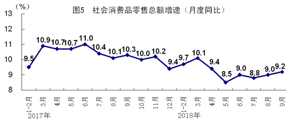 前三季度,社會(huì)消費(fèi)品零售總額274299億元,同比增長9.3%,增速比上半年回落0.1個(gè)百分點(diǎn)。按經(jīng)營單位所在地分,城鎮(zhèn)消費(fèi)品零售額234717億元,增長9.1%;鄉(xiāng)村消費(fèi)品零售額39582億元,增長10.4%。按消費(fèi)類型分,餐飲收入29763億元,增長9.8%;商品零售244536億元,增長9.2%。消費(fèi)升級(jí)類商品銷售增長較快,在限額以上單位商品零售額中,石油及制品類、通訊器材類同比分別增長14.4%和10.7%,比上年同期分別加快5.4和1.4個(gè)百分點(diǎn)。9月份,社會(huì)消費(fèi)品零售總額同比增長9.2%,比上月加快0.2個(gè)百分點(diǎn)。前三季度,全國居民人均消費(fèi)支出14281元,同比名義增長8.5%,比上年同期加快1.0個(gè)百分點(diǎn);扣除價(jià)格因素實(shí)際增長6.3%,加快0.4個(gè)百分點(diǎn)。其中,城鎮(zhèn)居民人均消費(fèi)支出名義增長6.5%,加快0.3個(gè)百分點(diǎn);農(nóng)村居民人均消費(fèi)支出名義增長12.0%,加快3.4個(gè)百分點(diǎn)。