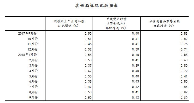 ?。?)根據(jù)季節(jié)調(diào)整模型自動(dòng)修正結(jié)果,對近一年來各期國內(nèi)生產(chǎn)總值、規(guī)模以上工業(yè)增加值、固定資產(chǎn)投資(不含農(nóng)戶)、社會(huì)消費(fèi)品零售總額環(huán)比增速進(jìn)行修訂。修訂結(jié)果及2018年三季度GDP環(huán)比數(shù)據(jù)、9月份其他指標(biāo)環(huán)比數(shù)據(jù)如下: