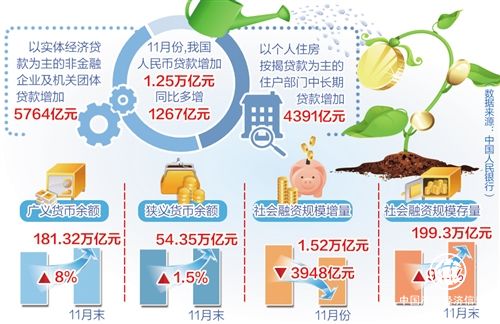 12月11日,中國(guó)人民銀行發(fā)布的金融統(tǒng)計(jì)數(shù)據(jù)顯示,11月份,人民幣貸款增加1.25萬(wàn)億元,同比多增1267億元,超出市場(chǎng)預(yù)期。11月末,廣義貨幣(M2)余額181.32萬(wàn)億元,同比增長(zhǎng)8%,增速與上月末持平,比上年同期低1.1個(gè)百分點(diǎn)。11月份,社會(huì)融資規(guī)模增量為1.52萬(wàn)億元,比上年同期少3948億元,但環(huán)比增加一倍。