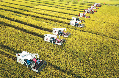 2018年9月20日,農(nóng)民駕駛收割機在江蘇省淮安市盱眙縣黃花塘鎮(zhèn)老營“蝦稻共生”示范基地收獲水稻。周海軍攝(新華社發(fā))