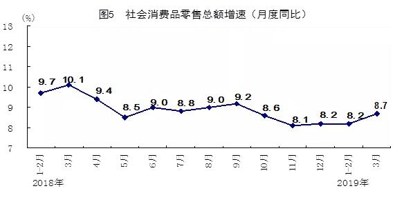 一季度,社會消費品零售總額97790億元,同比增長8.3%,增速比1-2月份加快0.1個百分點,比上年同期回落1.5個百分點。按經營單位所在地分,城鎮(zhèn)消費品零售額83402億元,增長8.2%;鄉(xiāng)村消費品零售額14388億元,增長9.2%。按消費類型分,餐飲收入10644億元,增長9.6%;商品零售87146億元,增長8.2%。消費升級類商品銷售增長較快,限額以上單位化妝品類、通訊器材類商品同比分別增長10.9%和10.0%,增速分別快于社會消費品零售總額2.6和1.7個百分點。3月份,社會消費品零售總額同比增長8.7%,比1-2月份加快0.5個百分點,環(huán)比增長0.91%。