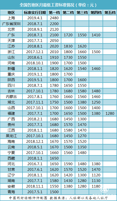 上海人社局此前公布消息,從2019年4月1日起,上海市職工月最低工資標準從2420元調(diào)整為2480元。此次上調(diào)額度為60元,較往年的一二百元的標準下降不少。