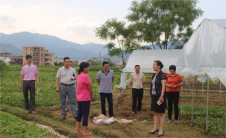 右二為連平縣扶貧辦主任許建花等領(lǐng)導(dǎo)小組到富樂(lè)村大棚蔬菜種植基地指導(dǎo)和調(diào)查貧困戶的種植收成情況(攝影/黃青龍)