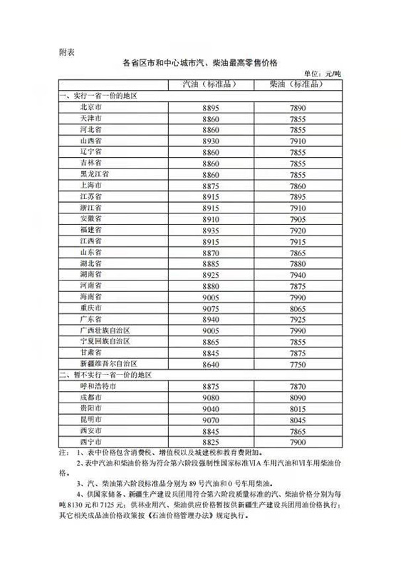 附:各省區(qū)市和中心城市汽、柴油最高零售價格