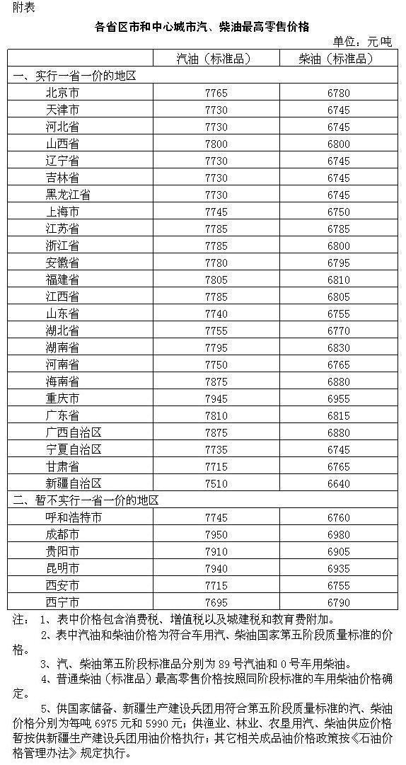 根據(jù)近期國(guó)際市場(chǎng)油價(jià)變化情況,按照現(xiàn)行成品油價(jià)格形成機(jī)制,自2017年5月11日24時(shí)起,國(guó)內(nèi)汽、柴油價(jià)格(標(biāo)準(zhǔn)品,下同)每噸分別降低250元和235元。調(diào)整后,各?。▍^(qū)、市)和中心城市汽、柴油最高零售價(jià)格見(jiàn)附表。相關(guān)價(jià)格聯(lián)動(dòng)及補(bǔ)貼政策按現(xiàn)行規(guī)定執(zhí)行。