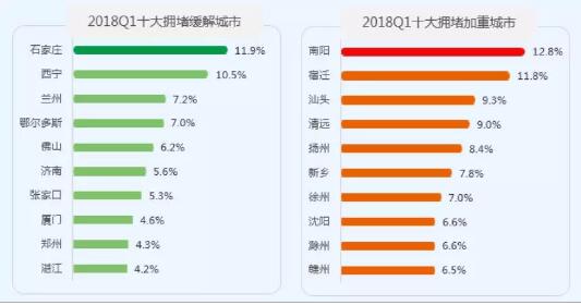 本季報(bào)告還公布了最新中國(guó)堵城排行榜,TOP10依次為銀川、濟(jì)南、洛陽(yáng)、北京、呼和浩特、贛州、合肥、哈爾濱、茂名、汕頭。其中,銀川力壓老牌堵城濟(jì)南,成為第一季度首堵,北京、上海、廣州、深圳一線(xiàn)城市排名下降,洛陽(yáng)、贛州、茂名、汕頭、合肥等大、中型城市排名上升。