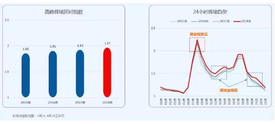 從24小時(shí)擁堵分布來(lái)看,2018年3月21-4月10日期間,上海全天各時(shí)段較近四年均有加重,其中早高峰漲幅明顯,早高峰平均擁堵指數(shù)比2017年早高峰均值加重8.1%,而平峰和夜間指數(shù)漲幅最高。