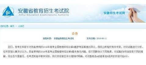 上述省份招生部門發(fā)布說明稱,經(jīng)學(xué)科專家評議認(rèn)為,該題本身沒有問題,但不同考生從不同學(xué)科角度,對試題選項(xiàng)會有不同的理解。綜合各方面意見,考慮高中教學(xué)的實(shí)際等因素,經(jīng)研究決定,在該省理科綜合科目評卷中,對該題單選A或單選B的,均給6分。
