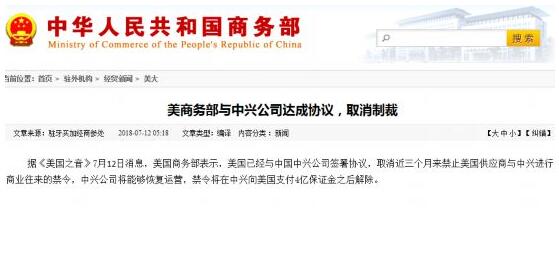 商務部網(wǎng)站7月12日消息顯示,據(jù)《美國之音》7月12日消息,美國商務部表示,美國已經(jīng)與中國中興公司簽署協(xié)議,取消近三個月來禁止美國供應商與中興進行商業(yè)往來的禁令,中興公司將能夠恢復運營,禁令將在中興向美國支付4億保證金之后解除。