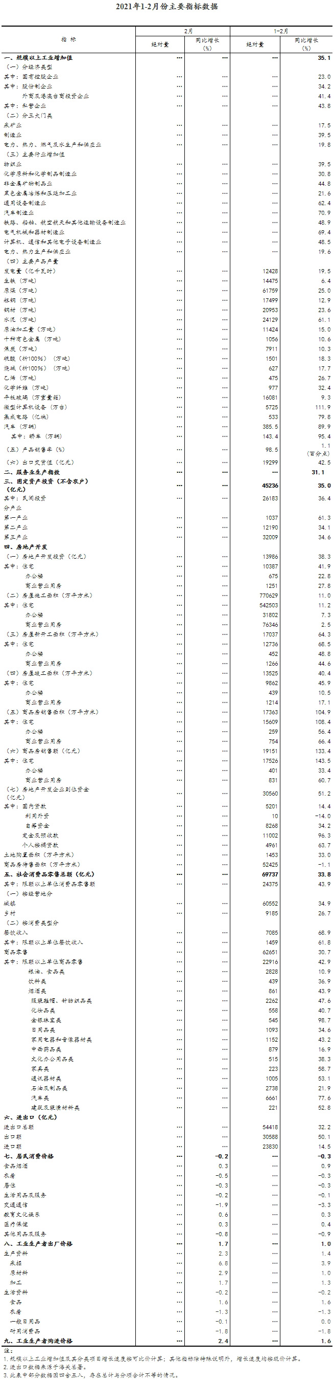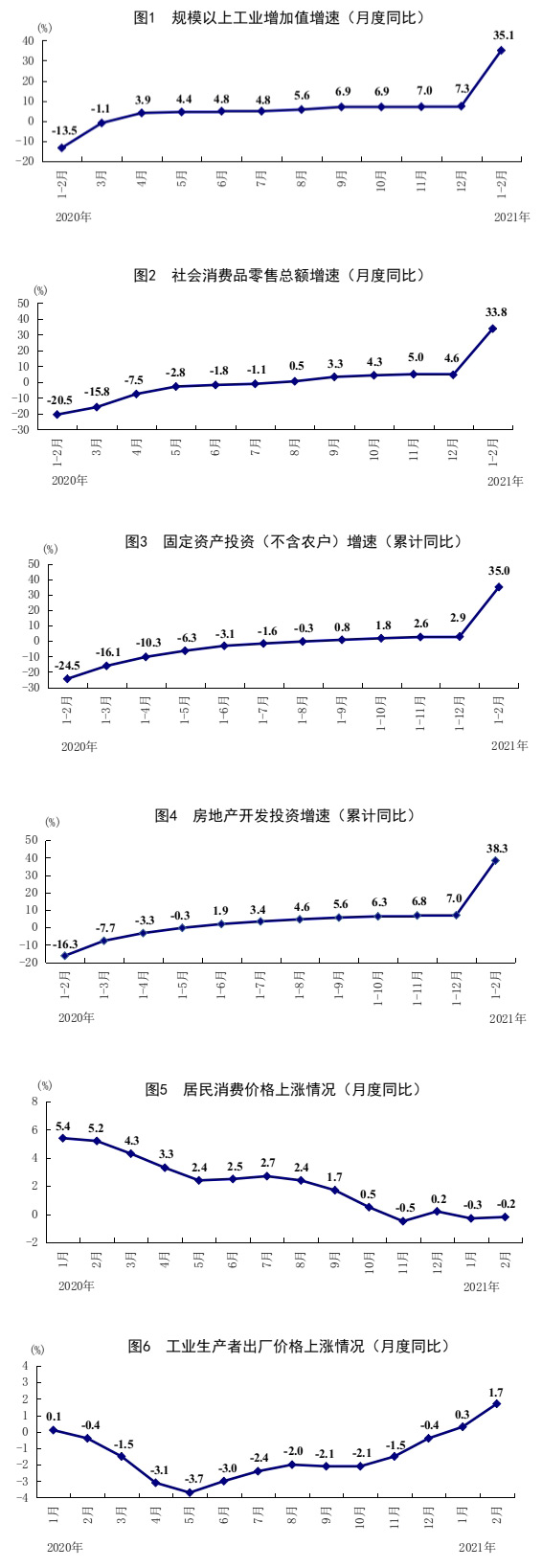 1-2月份,在以習近平同志為核心的黨中央堅強領(lǐng)導下,各地區(qū)各部門統(tǒng)籌疫情防控和經(jīng)濟社會發(fā)展成效持續(xù)顯現(xiàn),工業(yè)和出口較快增長,投資和消費穩(wěn)步恢復,就業(yè)和物價總體穩(wěn)定,基本民生保障有力,國民經(jīng)濟持續(xù)穩(wěn)定恢復。從同比數(shù)據(jù)看,受2020年同期基數(shù)較低等因素影響,主要指標同比增速較高,扣除基數(shù)影響,主要指標增勢平穩(wěn),宏觀指標處于合理區(qū)間。