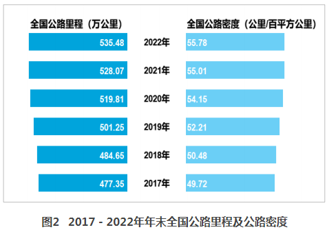 年末全國公路里程535.48萬公里,比上年末增加7.41萬公里。公路密度55.78公里/百平方公里,增加0.77公里/百平方公里。公路養(yǎng)護(hù)里程535.03萬公里,占公路里程比重為99.9%。
