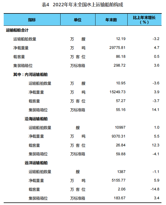 年末全國擁有水上運輸船舶12.19萬艘,比上年末減少0.40萬艘,凈載重量2.98億噸、增加0.13億噸,載客量86.18萬客位、增加0.40萬客位,集裝箱箱位298.72萬標(biāo)準(zhǔn)箱、增加10.29萬標(biāo)準(zhǔn)箱。