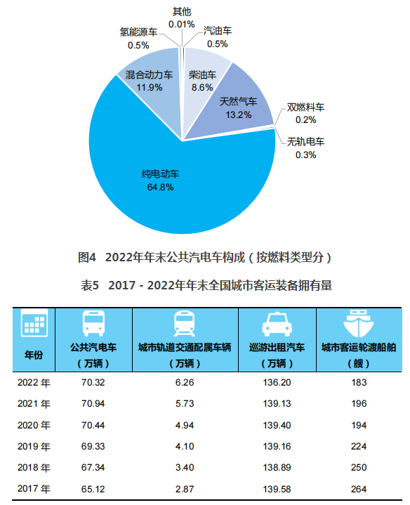 年末全國擁有公共汽電車70.32萬輛,比上年末減少0.63萬輛,其中純電動車45.55萬輛、增加3.59萬輛,占公共汽電車比重為64.8%、提高5.6個百分點。擁有城市軌道交通配屬車輛6.26萬輛,增加0.53萬輛。擁有巡游出租汽車136.20萬輛,減少2.93萬輛。擁有城市客運輪渡船舶183艘。
