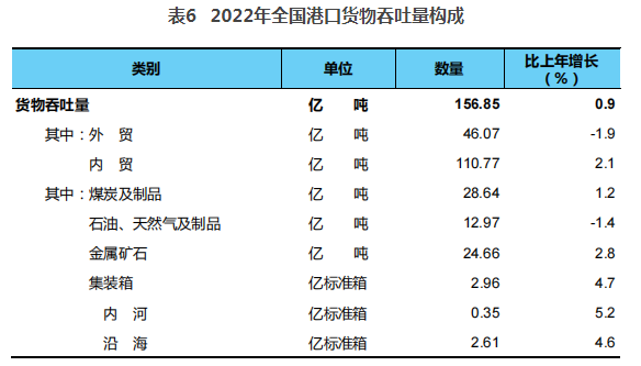 全年完成港口貨物吞吐量156.85億噸,比上年增長0.9%。其中,沿海港口貨物吞吐量101.31億噸、增長1.6%,內(nèi)河港口貨物吞吐量55.54億噸、下降0.3%;外貿(mào)貨物吞吐量46.07億噸、下降1.9%,內(nèi)貿(mào)貨物吞吐量110.77億噸、增長2.1%。完成集裝箱吞吐量2.96億標(biāo)準(zhǔn)箱,增長4.7%。完成集裝箱鐵水聯(lián)運量874.70萬標(biāo)準(zhǔn)箱,增長16.0%。