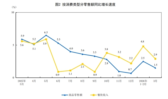 按消費類型分,3月份,商品零售額37257億元,同比增長1.5%;餐飲收入4359億元,增長2.9%。1—3月份,商品零售額113072億元,同比增長2.2%;餐飲收入14623億元,增長4.2%。